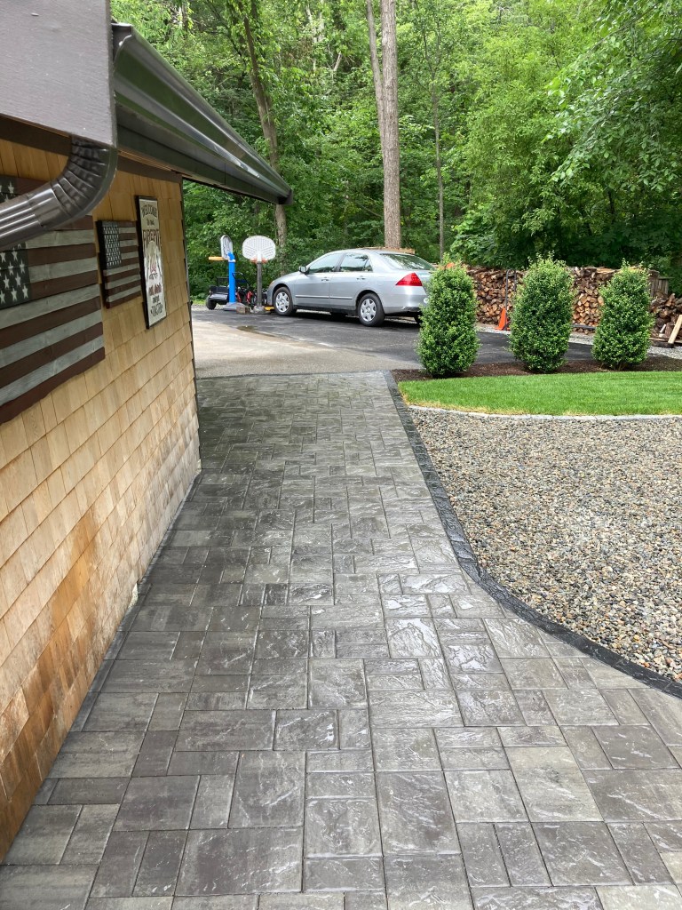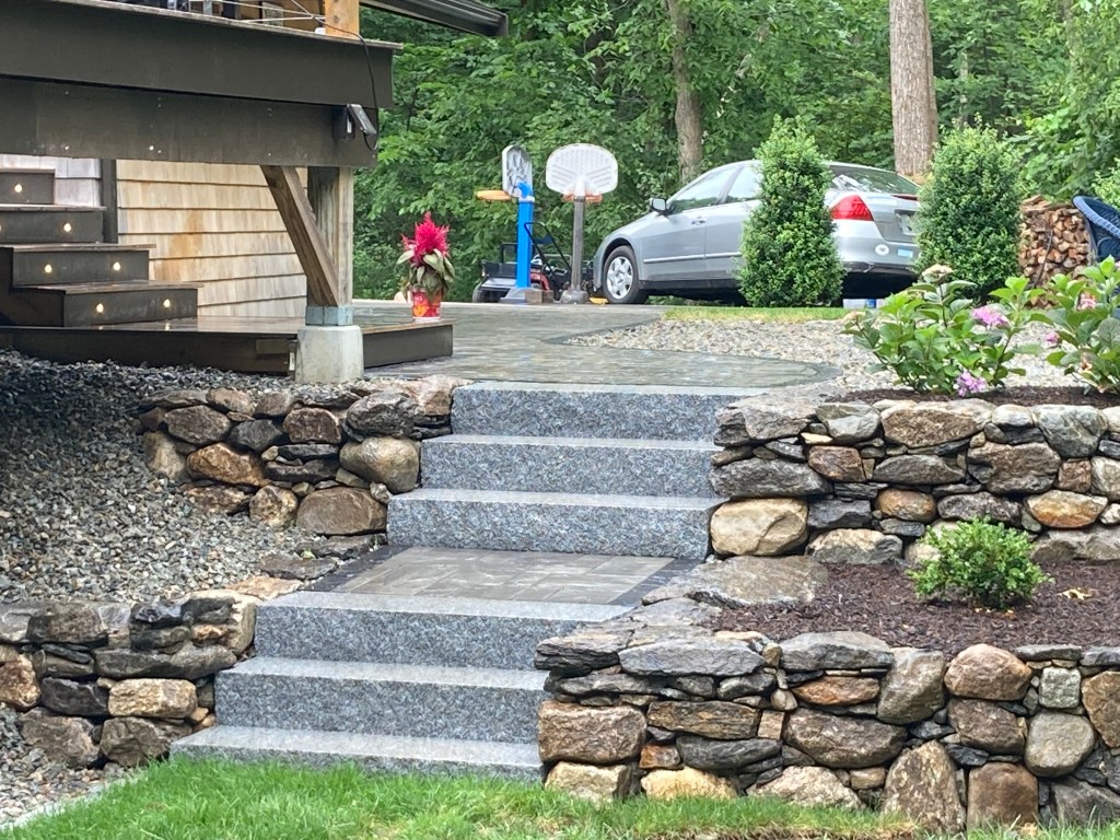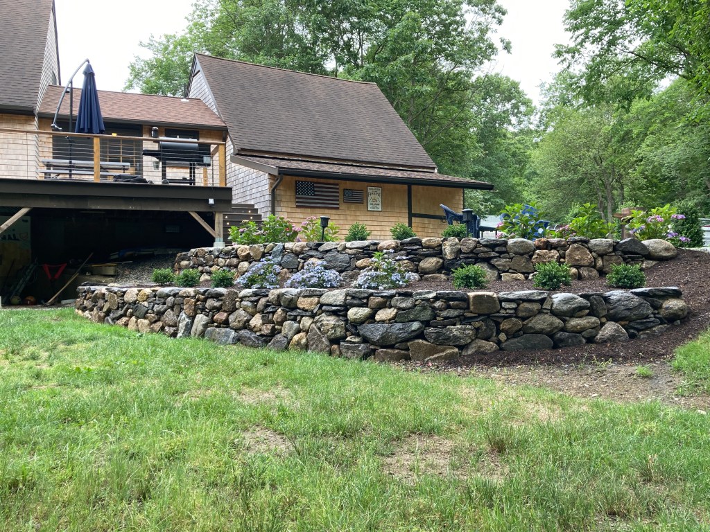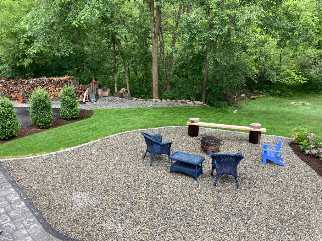 This project included a complete backyard makeover. The terraced stone walls are dry stacked using a Boston Blend N.E. fieldstone sourced from a supplier in MA. The walkway is Cambridge Ledgestone 3pc Onyx Natural in color with a charcoal border. The fire pit patio is compacted 3/4″ crushed stone. The project was finished off with select plantings sourced from a local nursery supplier and a small area of Kentucky Bluegrass sod.