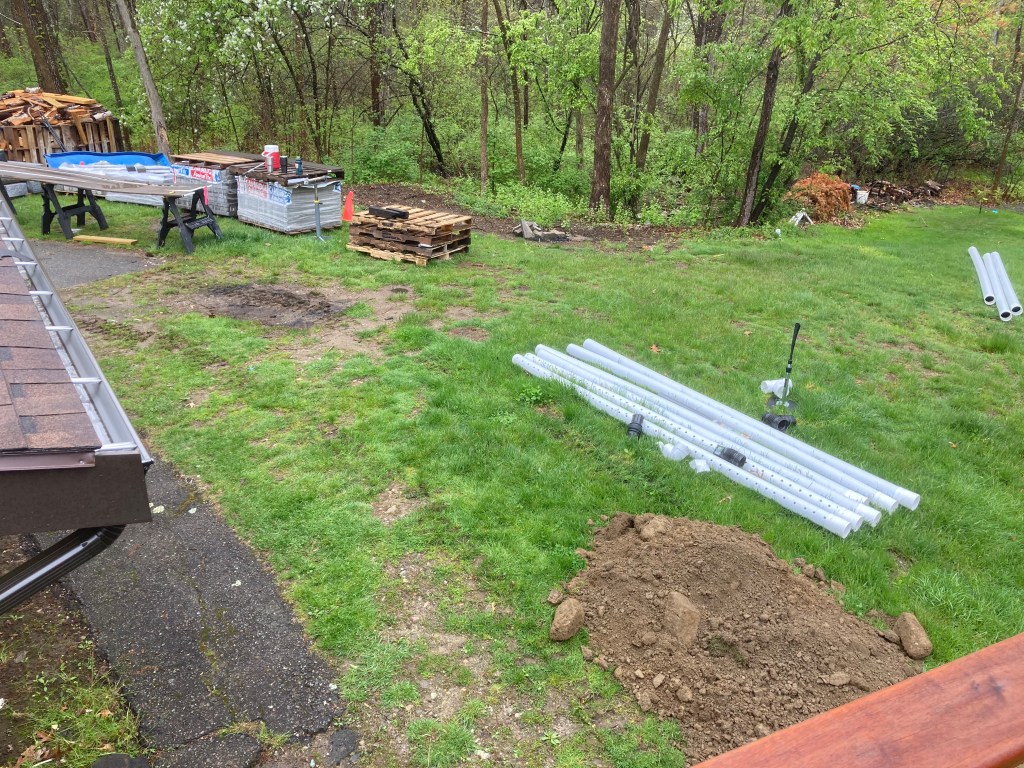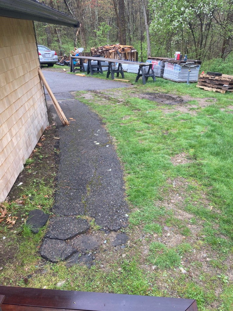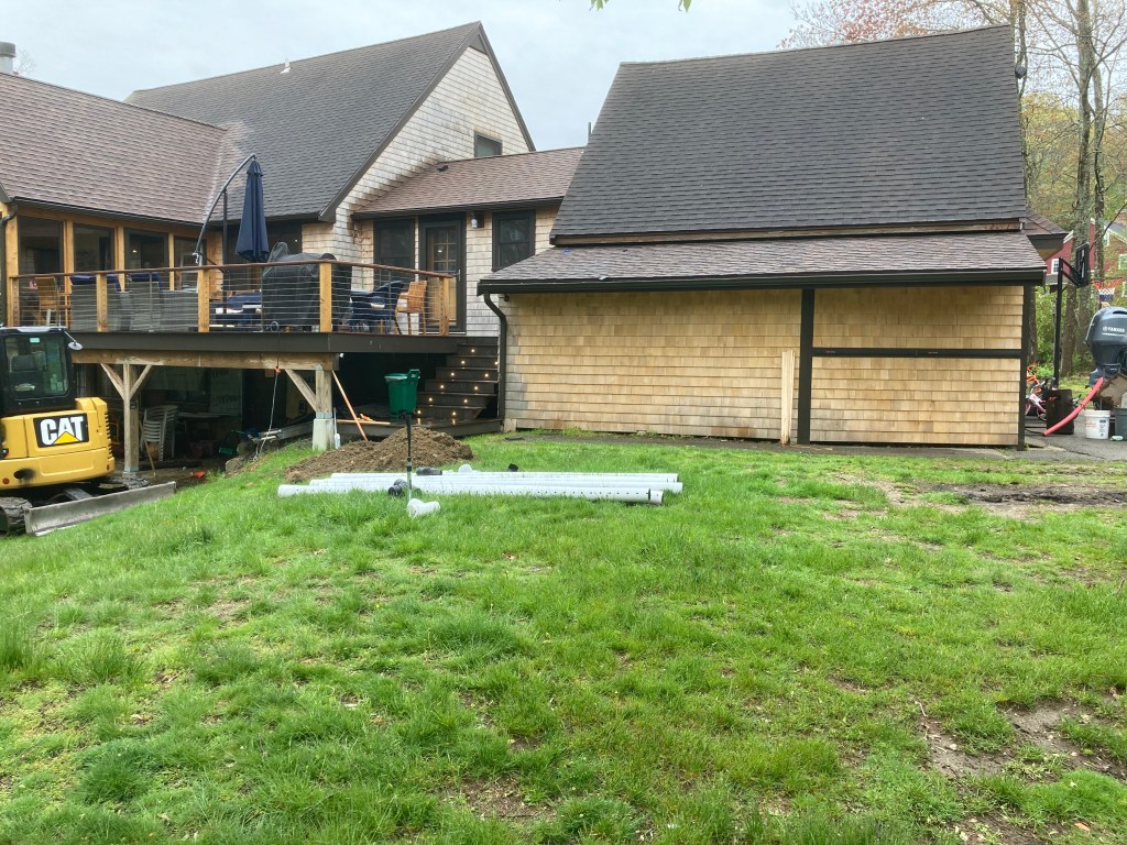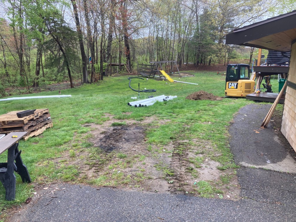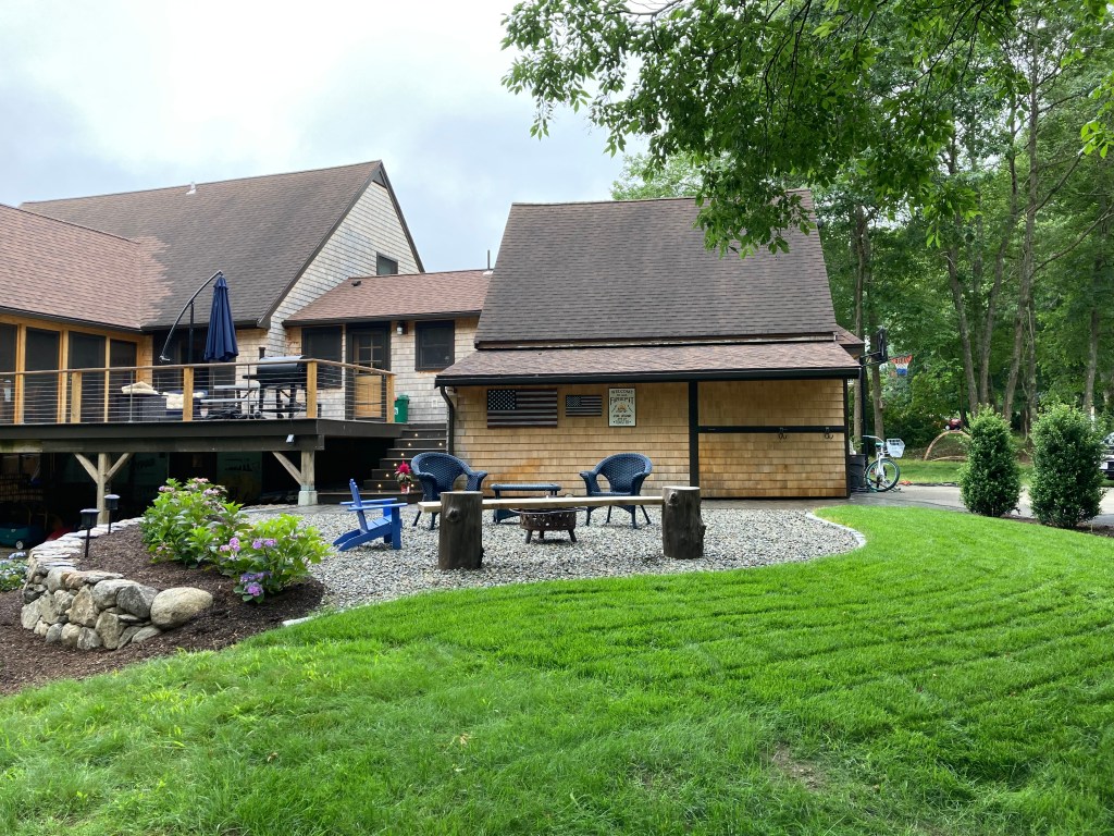 This project included a complete backyard makeover. The terraced stone walls are dry stacked using a Boston Blend N.E. fieldstone sourced from a supplier in MA. The walkway is Cambridge Ledgestone 3pc Onyx Natural in color with a charcoal border. The fire pit patio is compacted 3/4″ crushed stone. The project was finished off with select plantings sourced from a local nursery supplier and a small area of Kentucky Bluegrass sod.