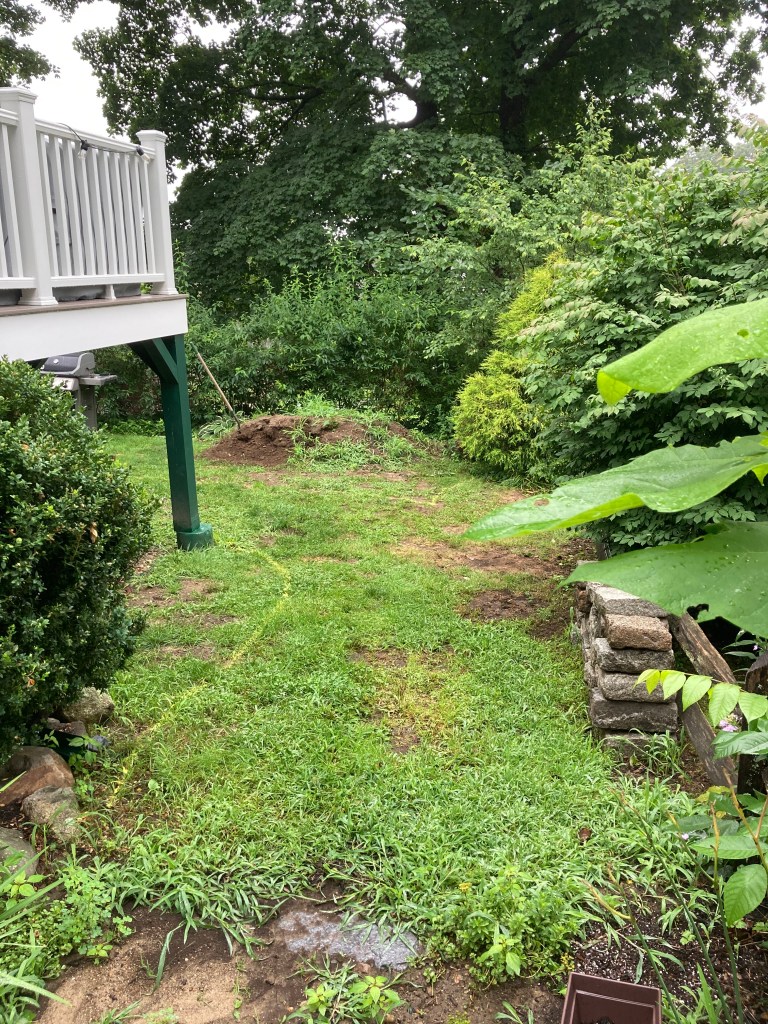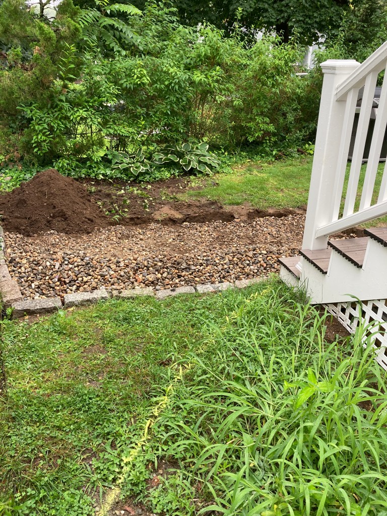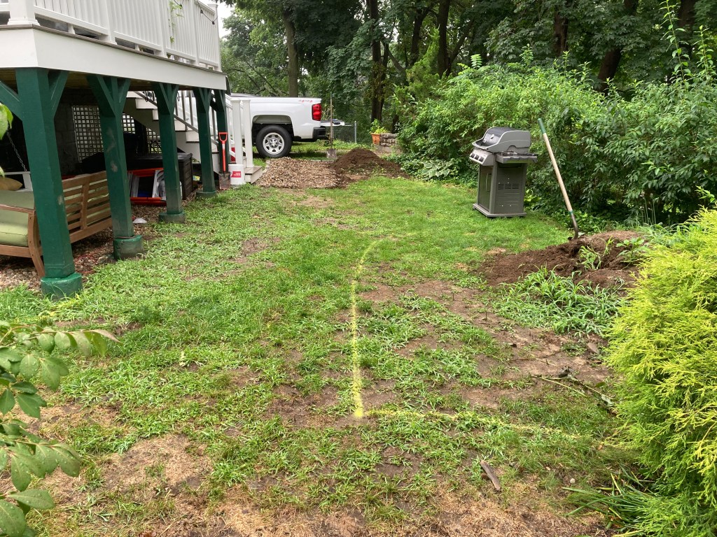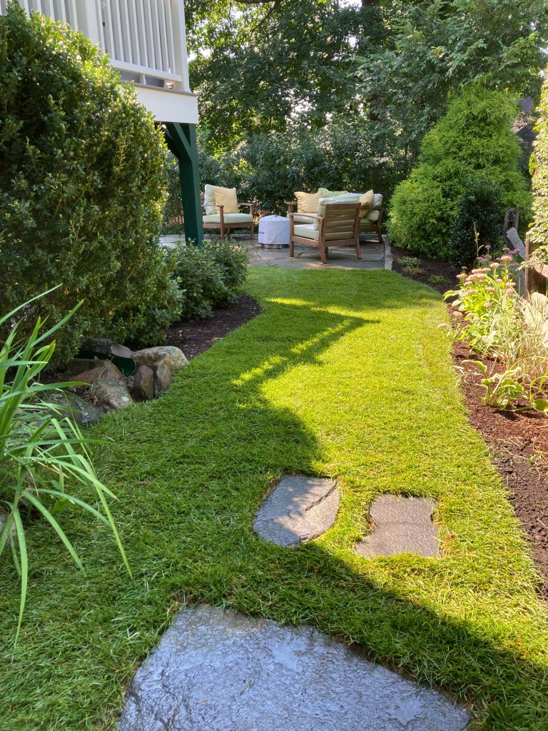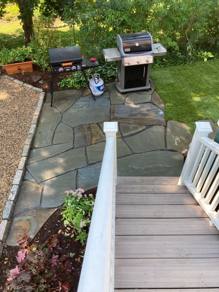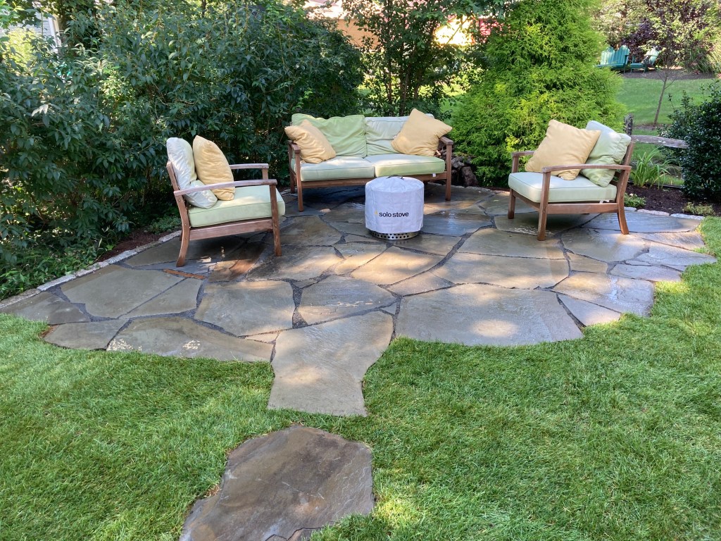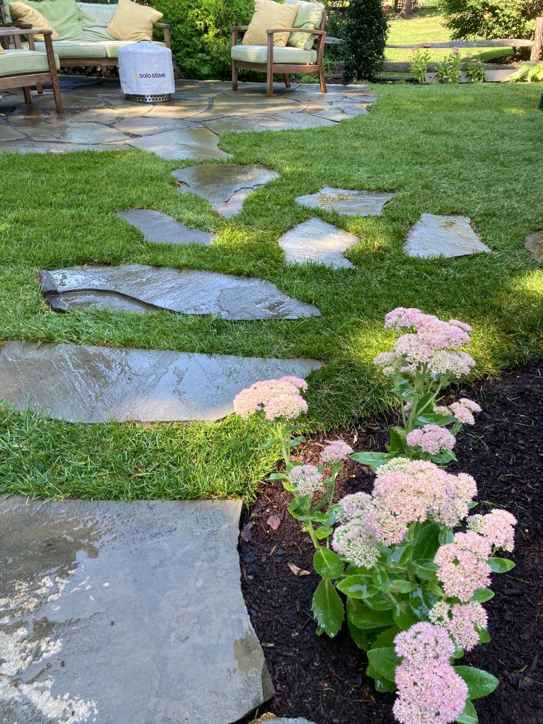 This walkway and patio were built out of irregular bluestone fit together to create tight joints between the pieces. Large step stones of the same material were laid in the sod to tie the the two areas together.