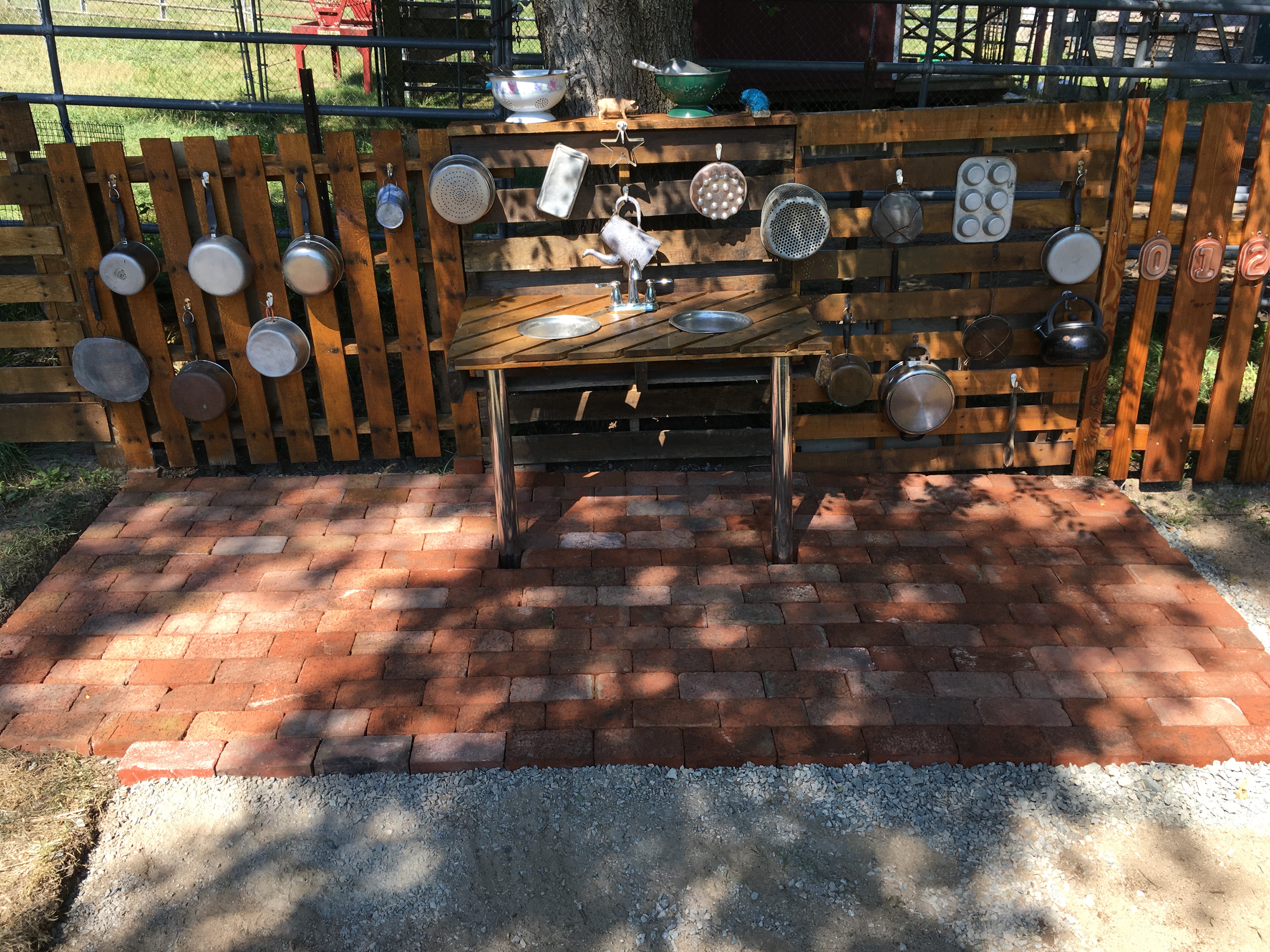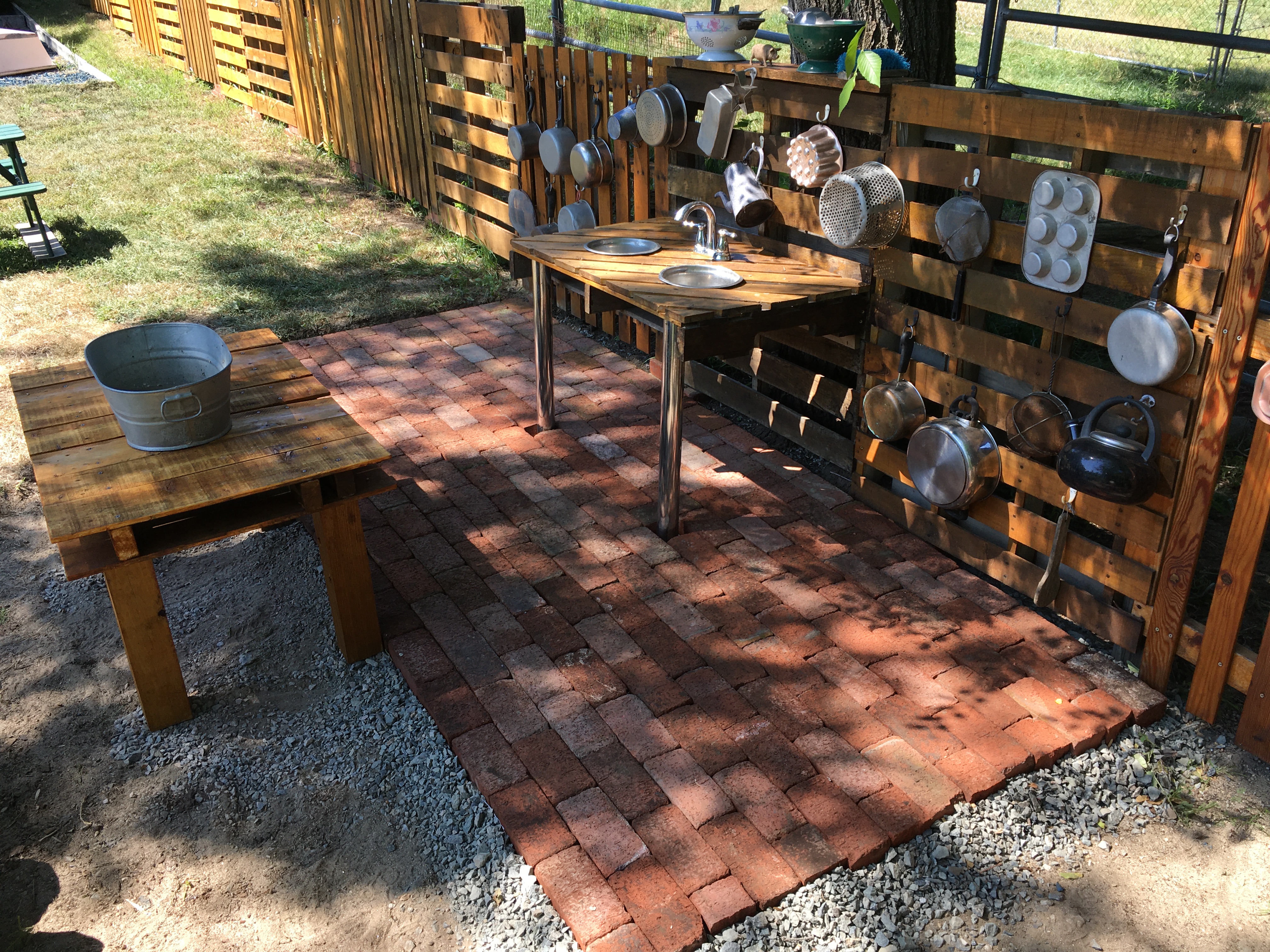 This project was built at a local preschool as an outdoor mud kitchen and an area where the kids can get their hands dirty. All the materials used are recycled and repurposed right down to the kitchen sink.