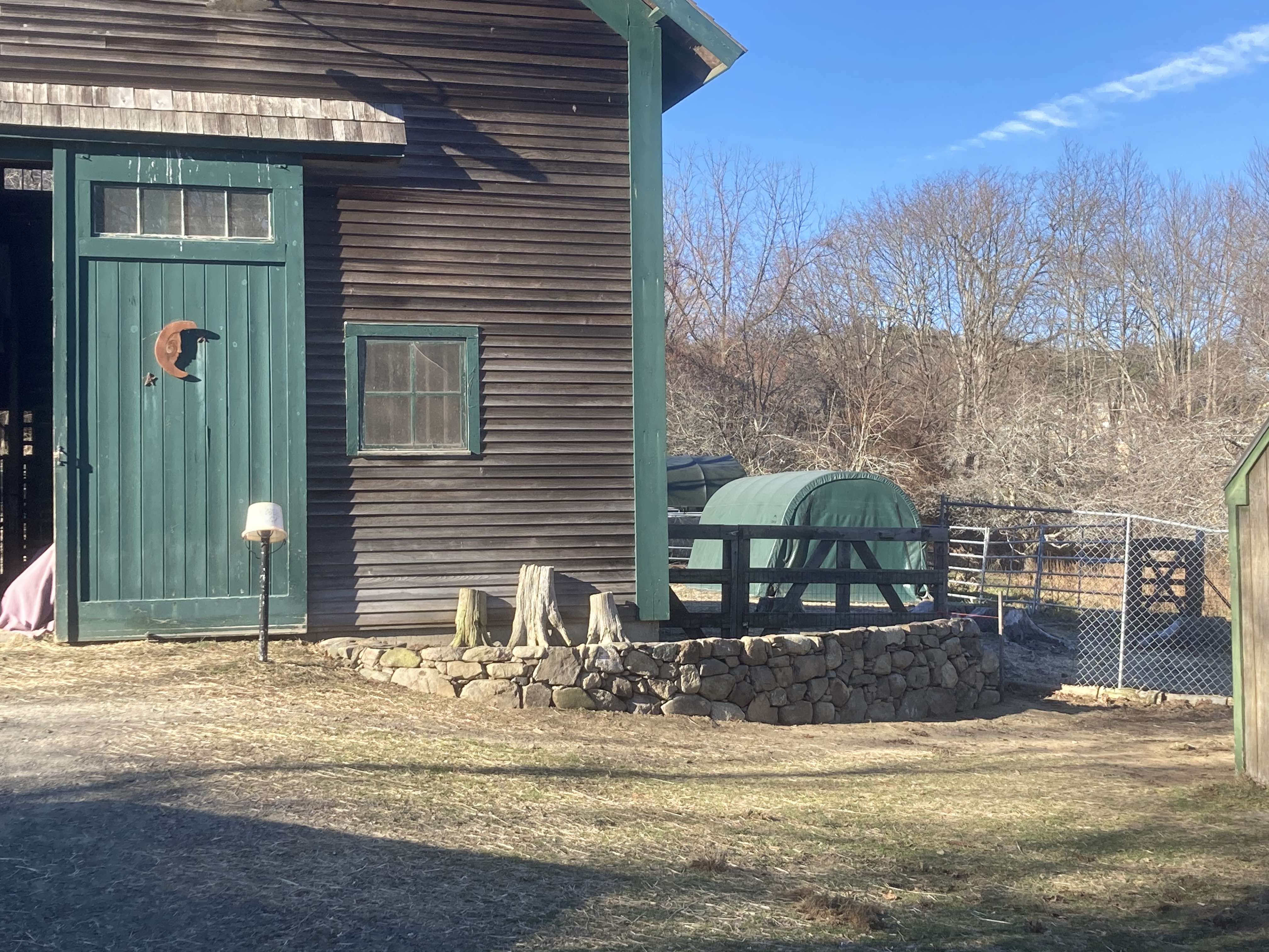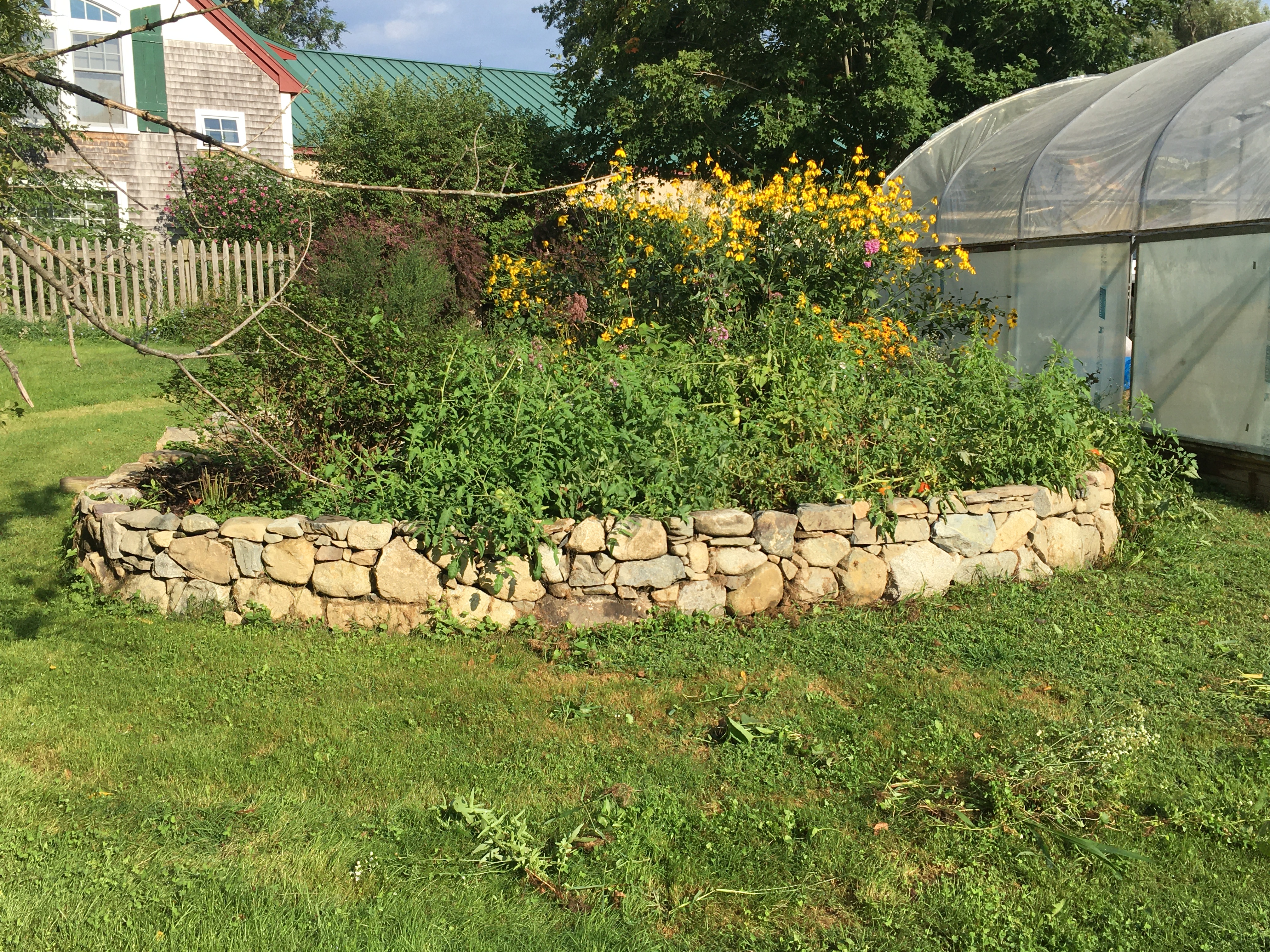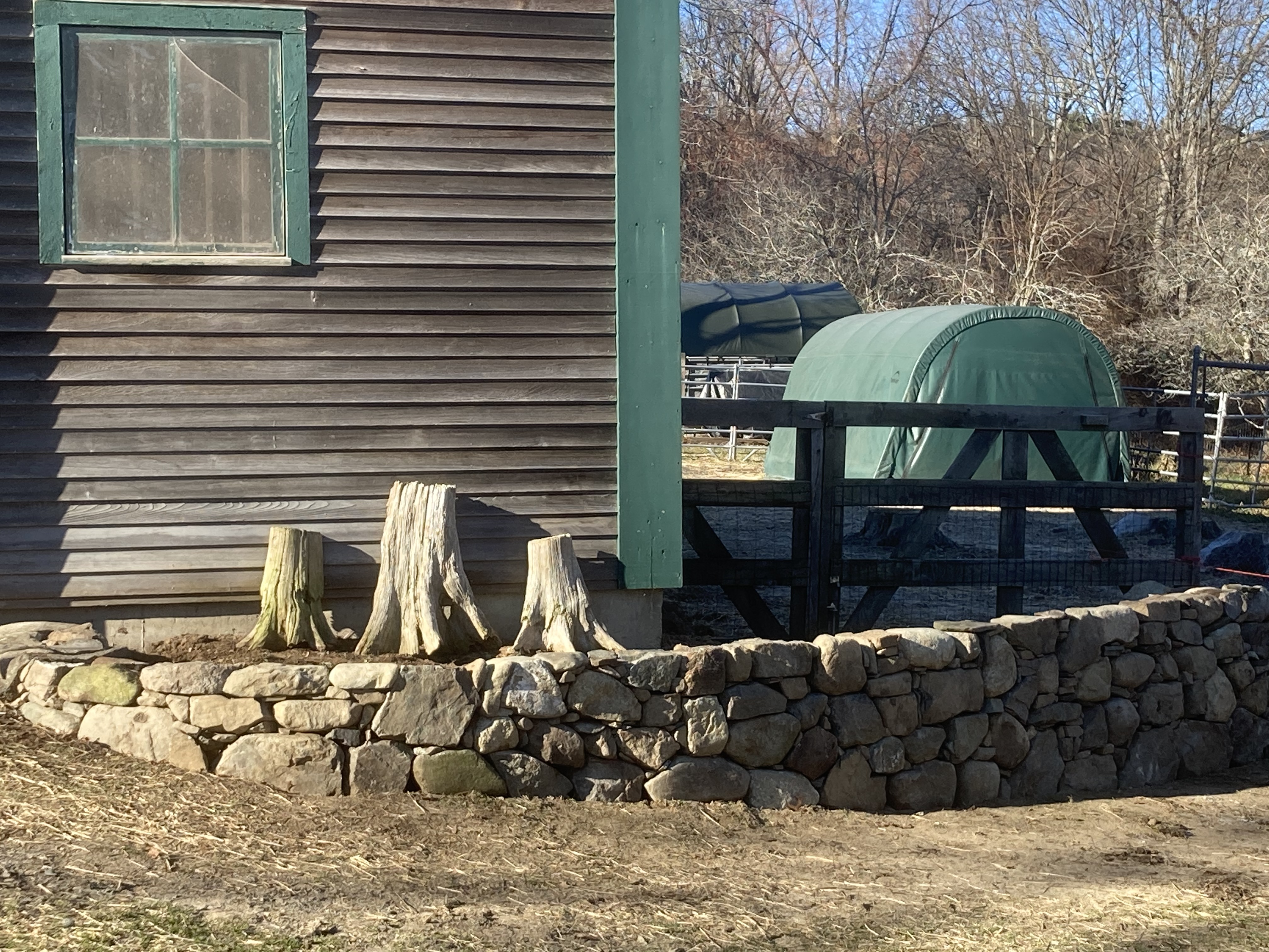 These New England fieldstone walls are dry stacked and built in the traditional style. The stone, which was originally used as an old farm building foundation, was unearthed while excavating to pour footings for a new building.
