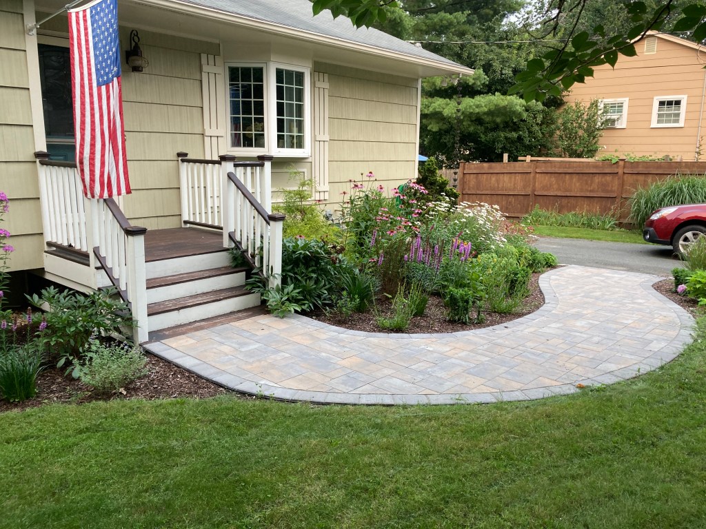 The paver walkway is made of Cambridge Sherwood Ledgestone 3pc Toffee Onyx Lite in color. Many of the plantings were existing on site and were transplanted or repurposed. A few additional plantings were added that were sourced from a local nursery supplier.