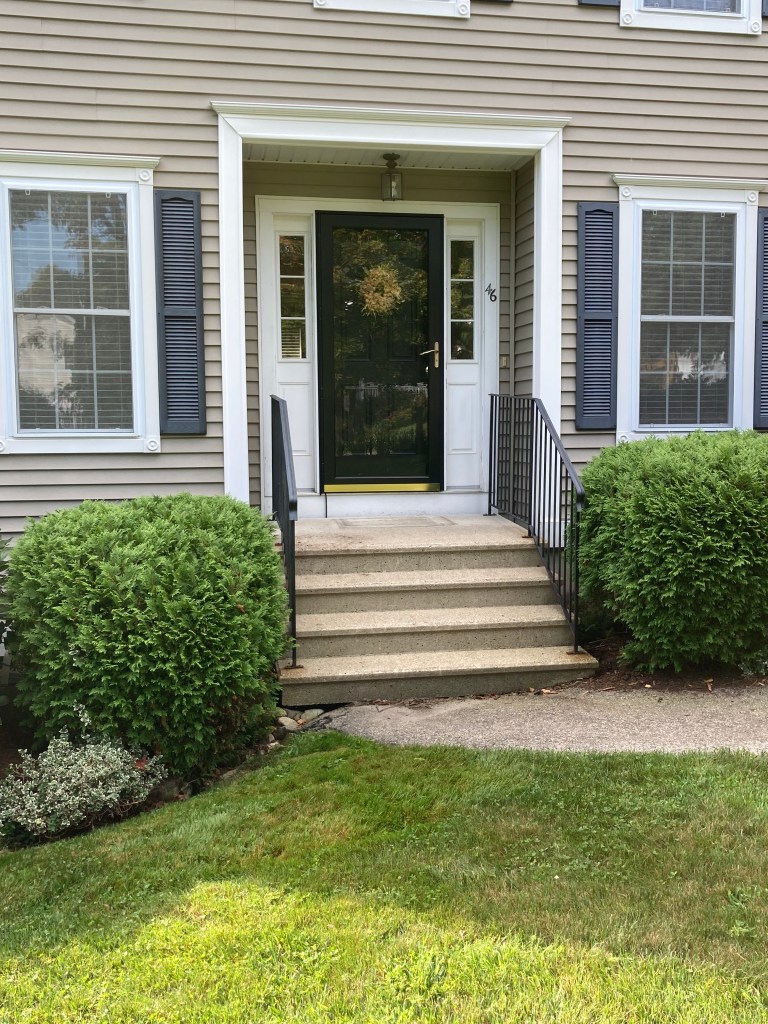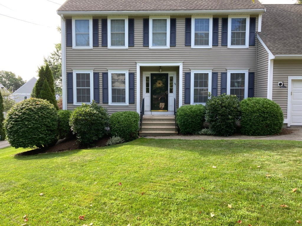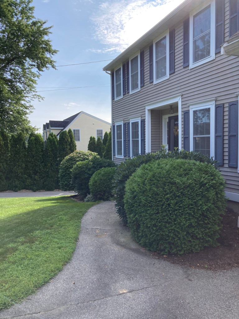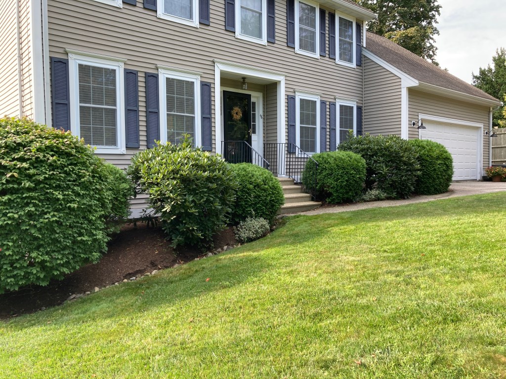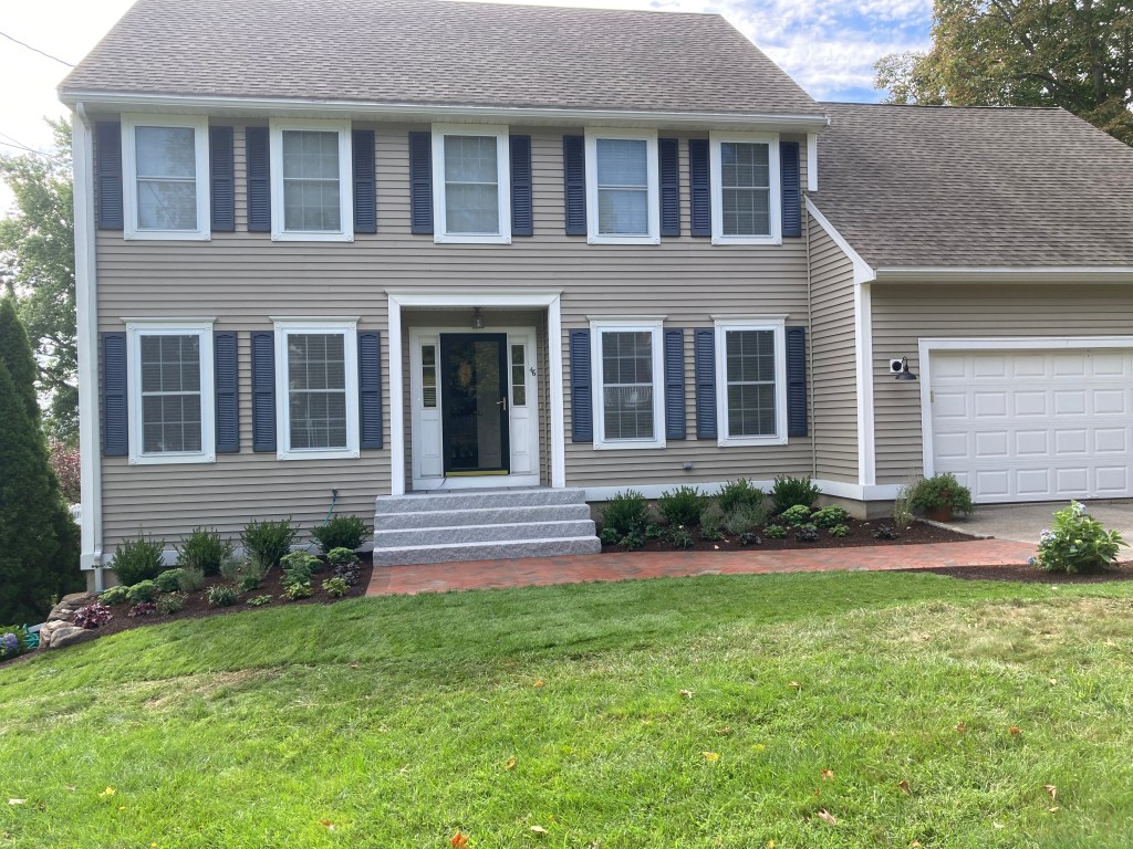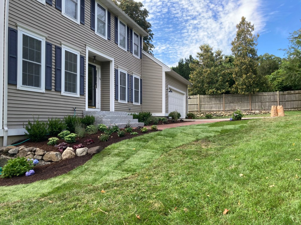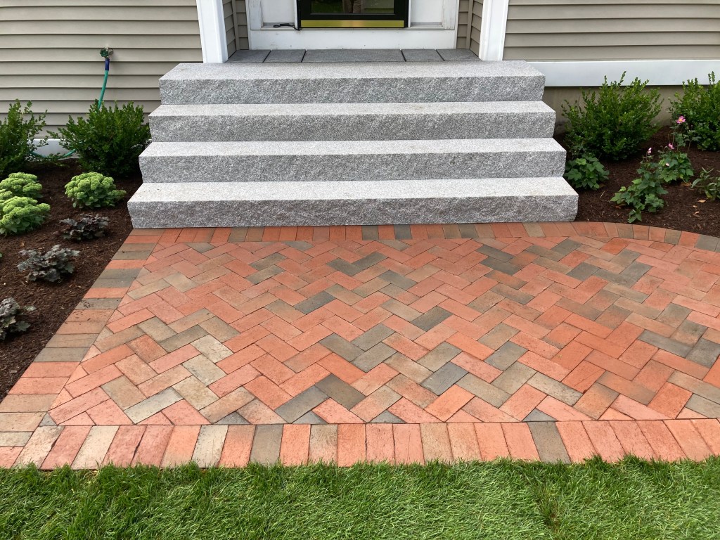 This front yard transformation featured a new Pine Hall clay brick walkway, over-sized granite front steps, in-laid granite pavers in the front door alcove, all new plant material sourced locally, a granite cobble border along the driveway and planting beds and Kentucky Bluegrass sod.