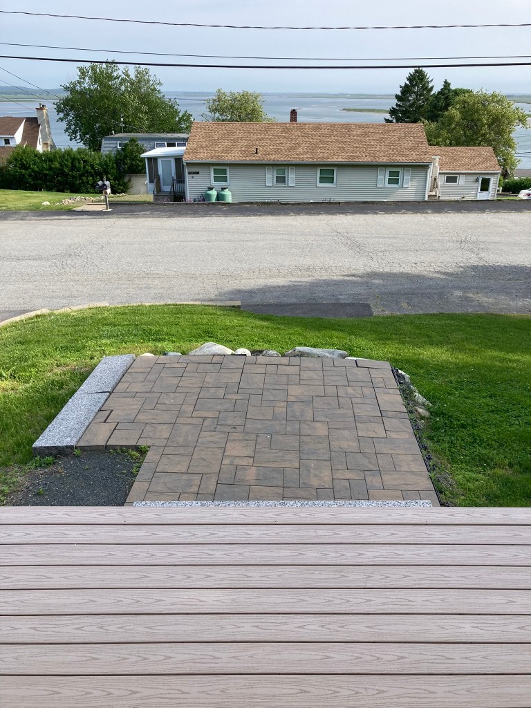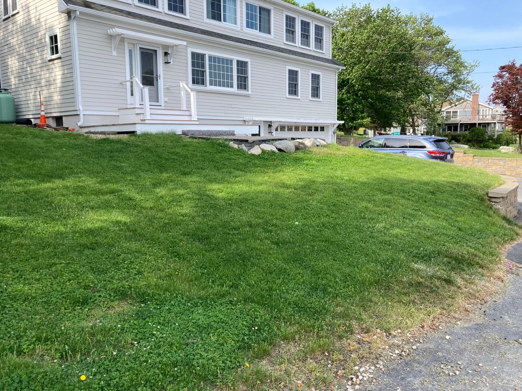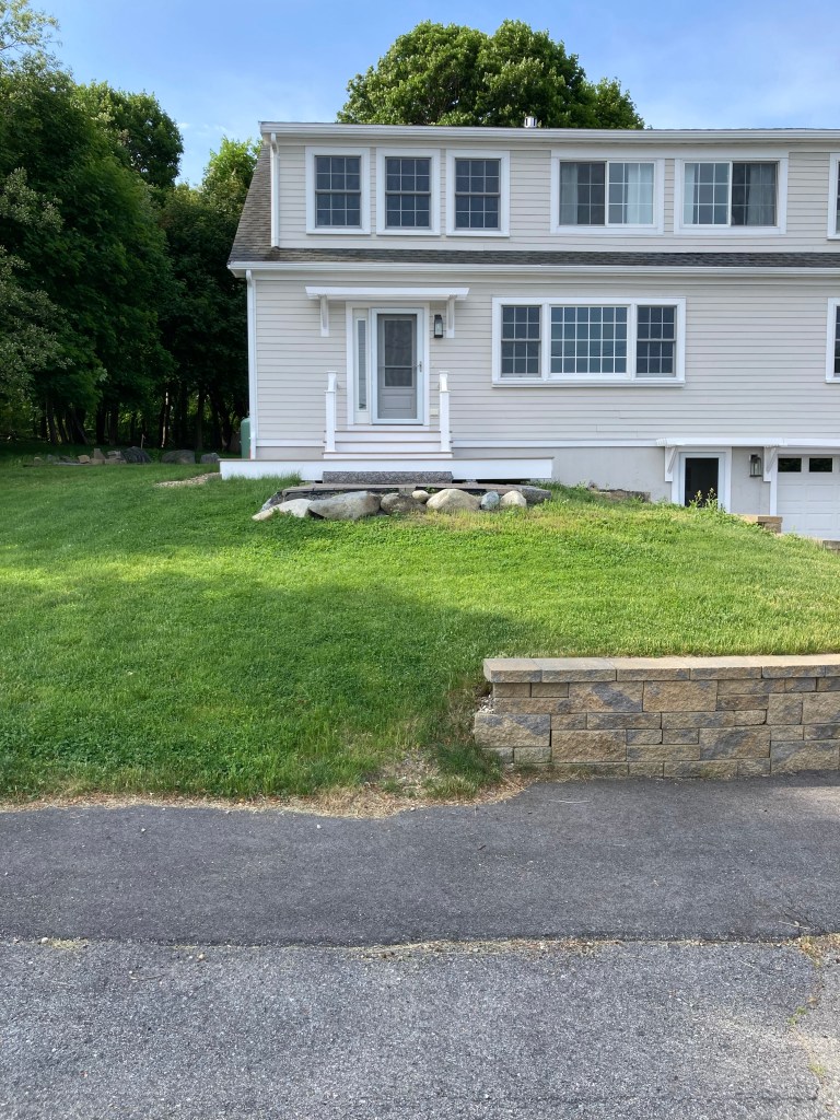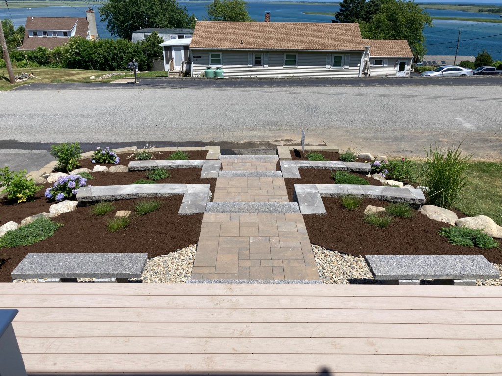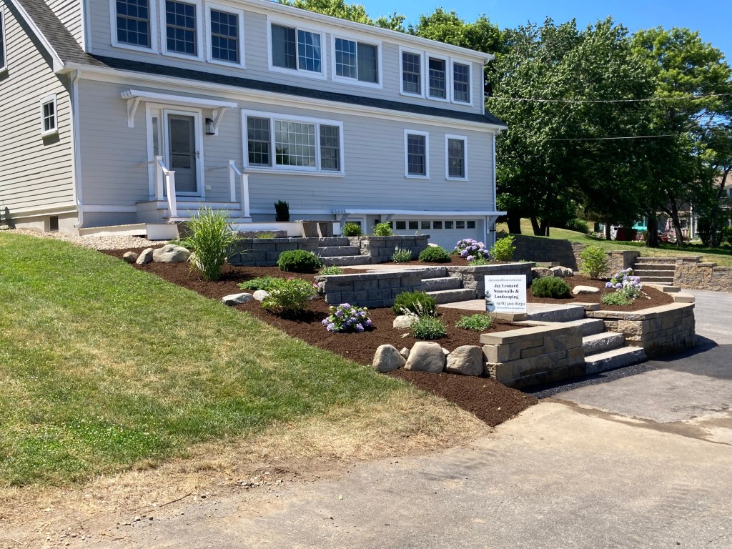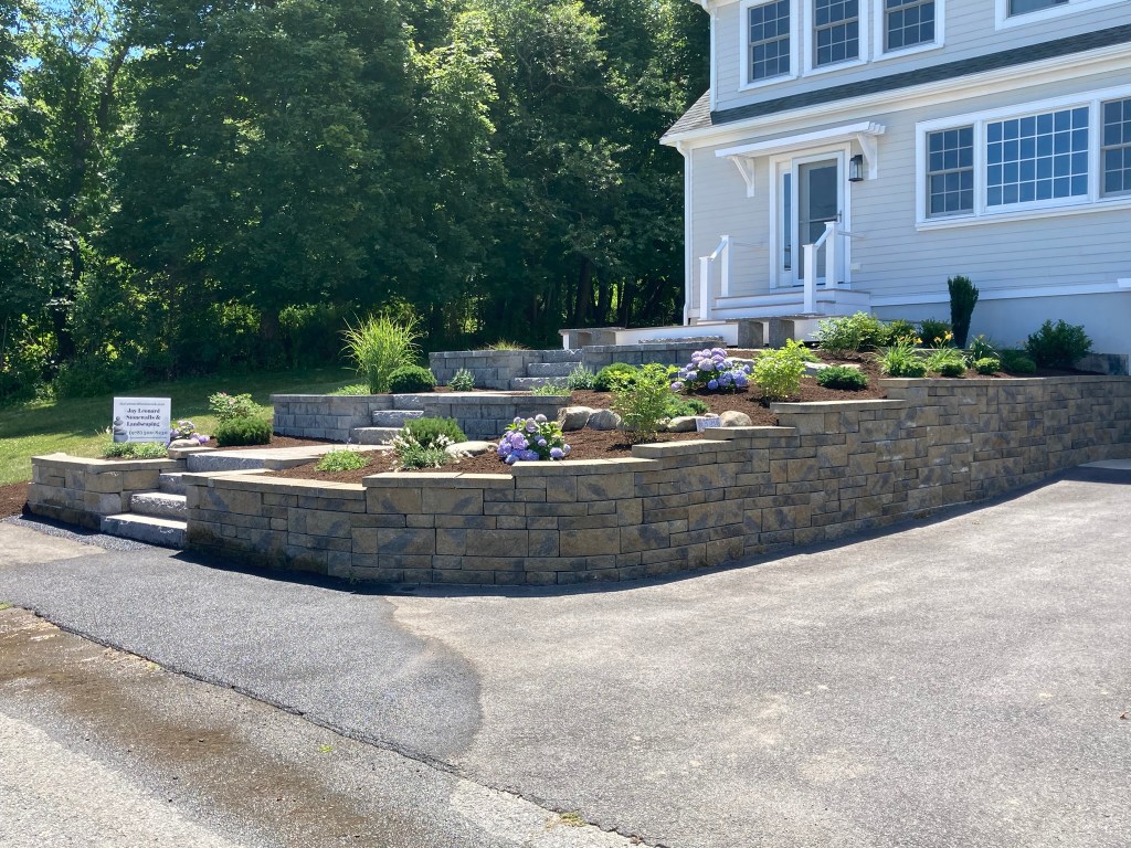 This front yard renovation in Ipswich took an unusable steep front slope and turned it into a functional entrance where the homeowner and their guests can now access the house through the front door. The lower wall along the driveway and right side of steps was existing. The middle and upper walls were built out of Belgard wall 9D Silex Blend. The granite steps are Caledonia in color. The pavers for the walkway sections are Cambridge Sherwood Ledgestone 3pc Toffee Onyx color. These were existing on site and were able to be reused. The plantings were sourced from a local nursery.