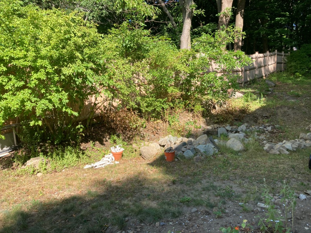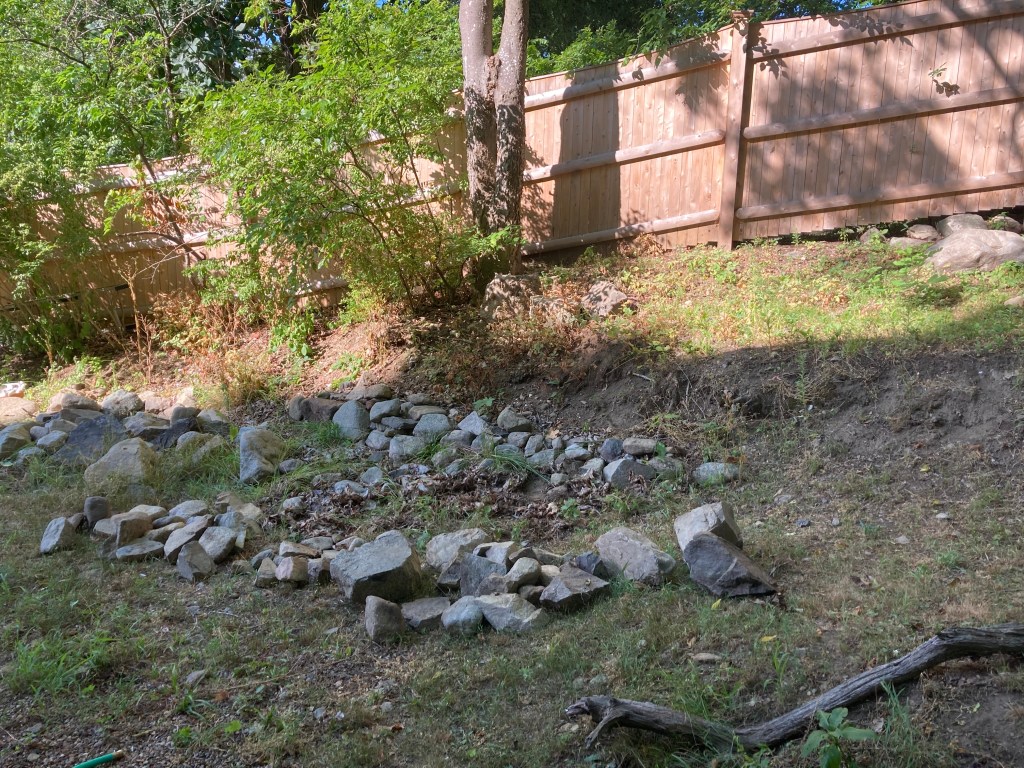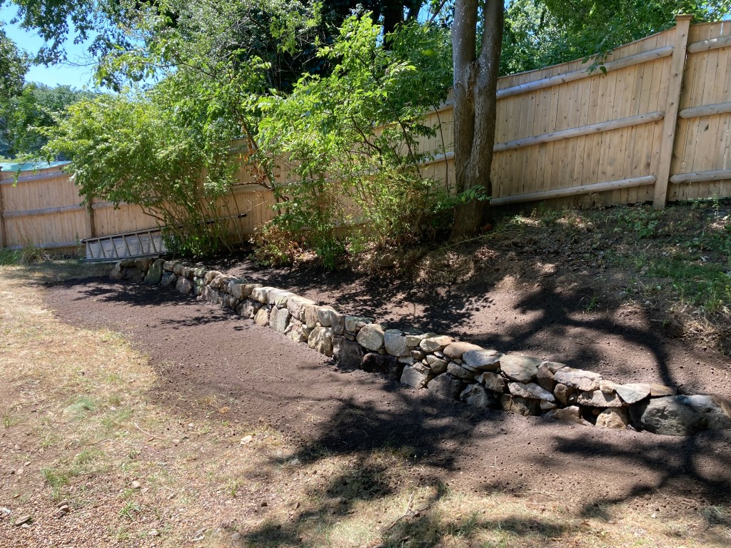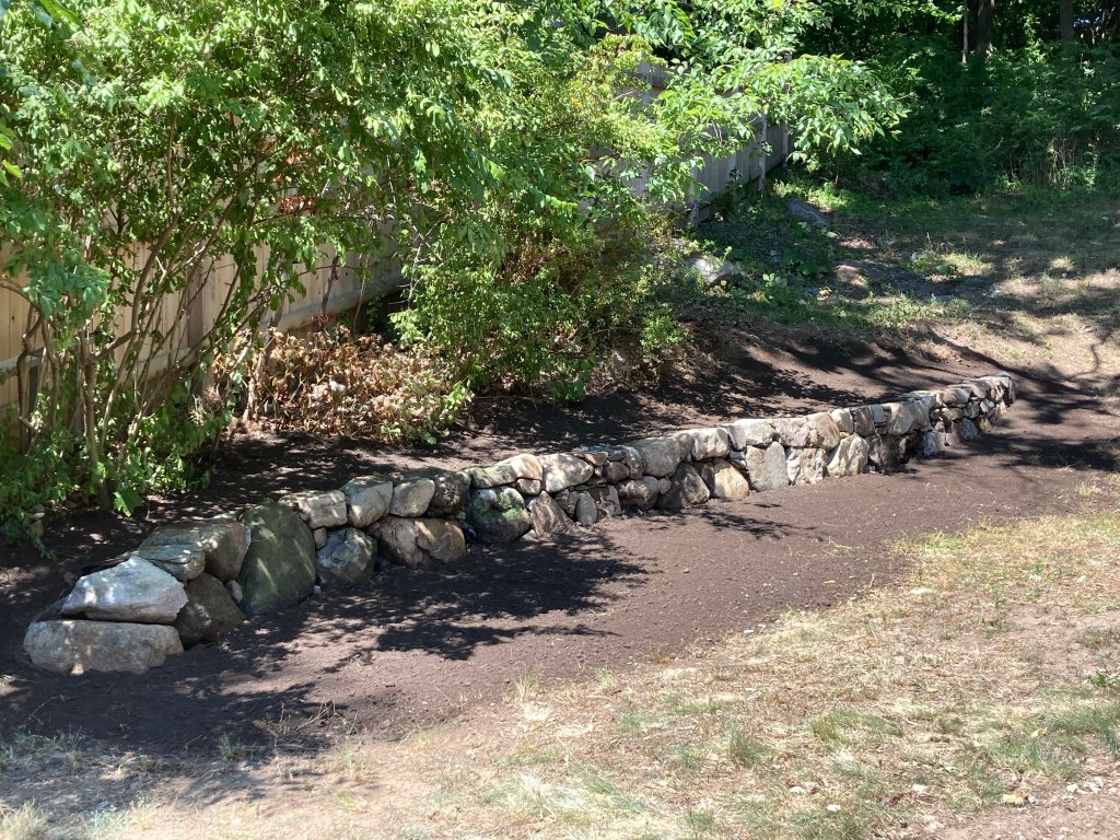 This low garden wall was built using native stones that were existing on site. It allowed for the slope behind it to be retained and give a space for future native plantings.