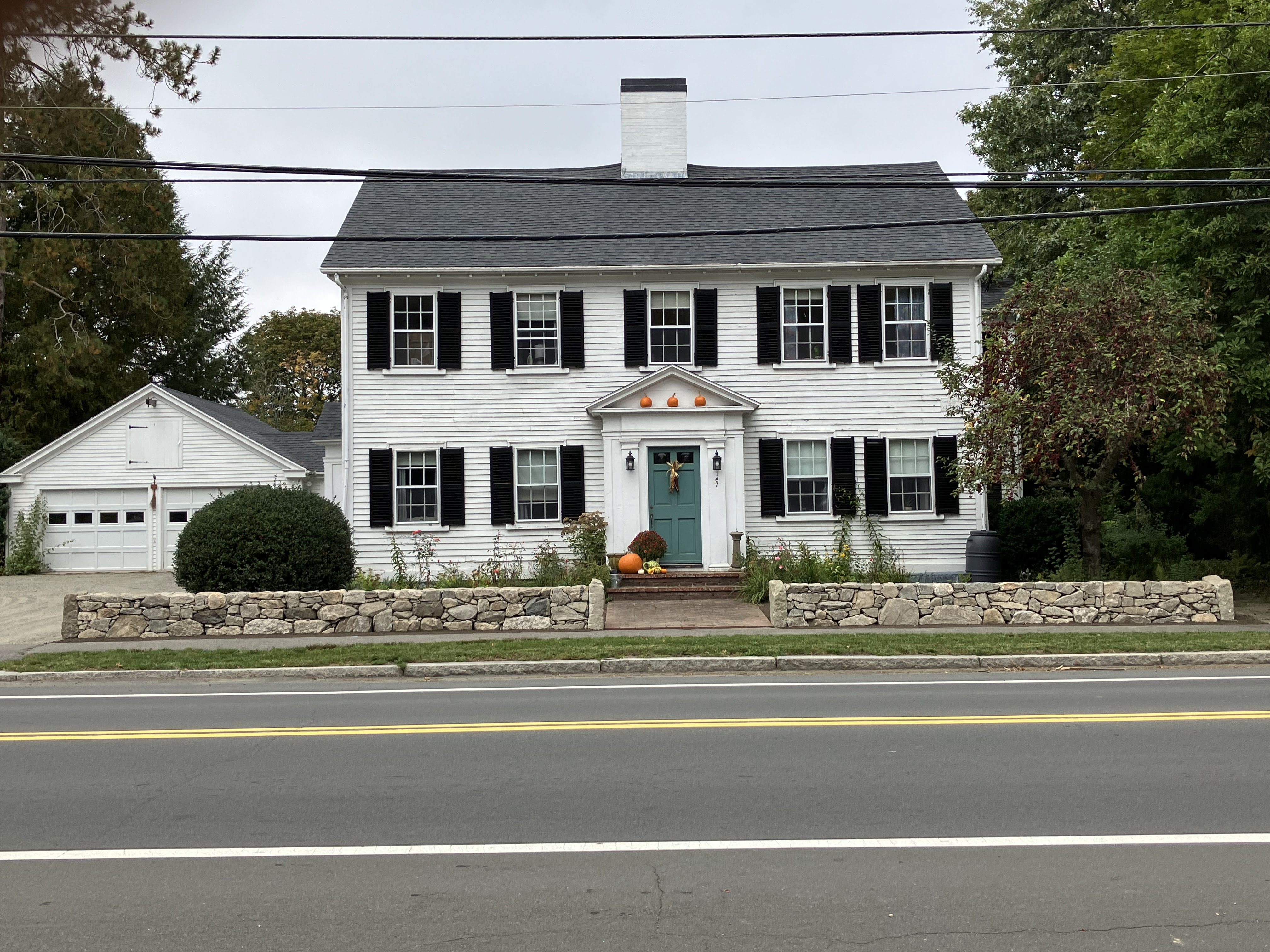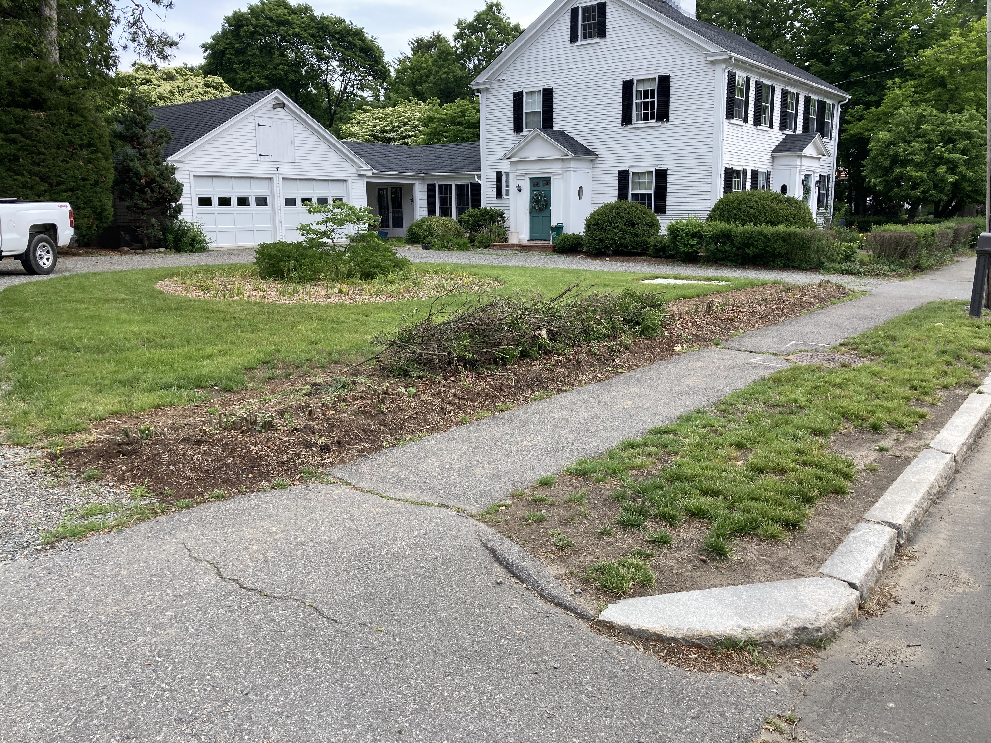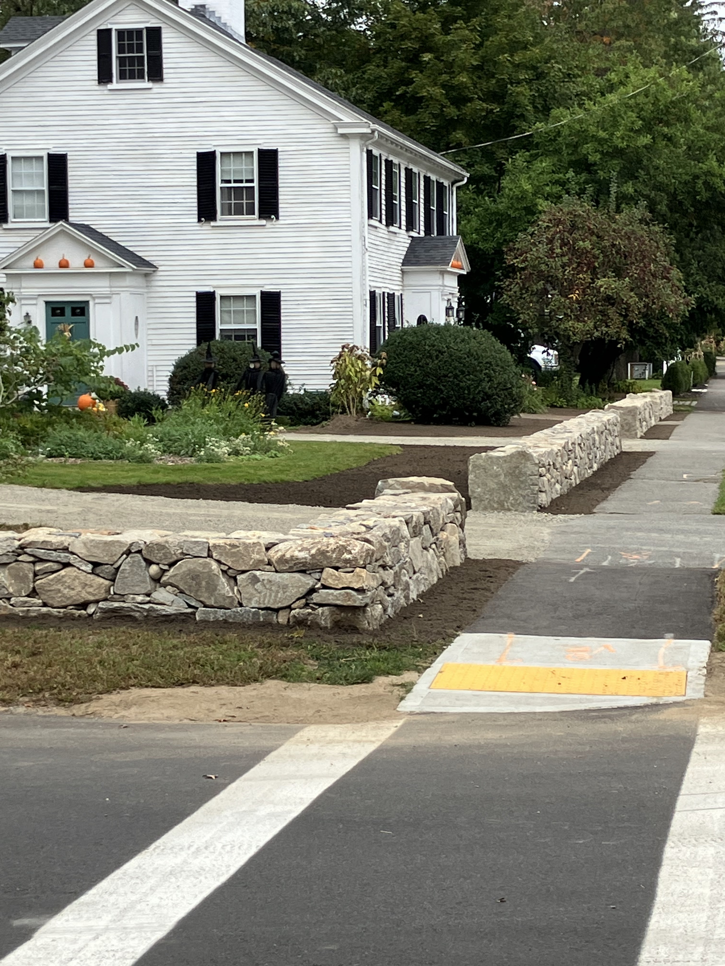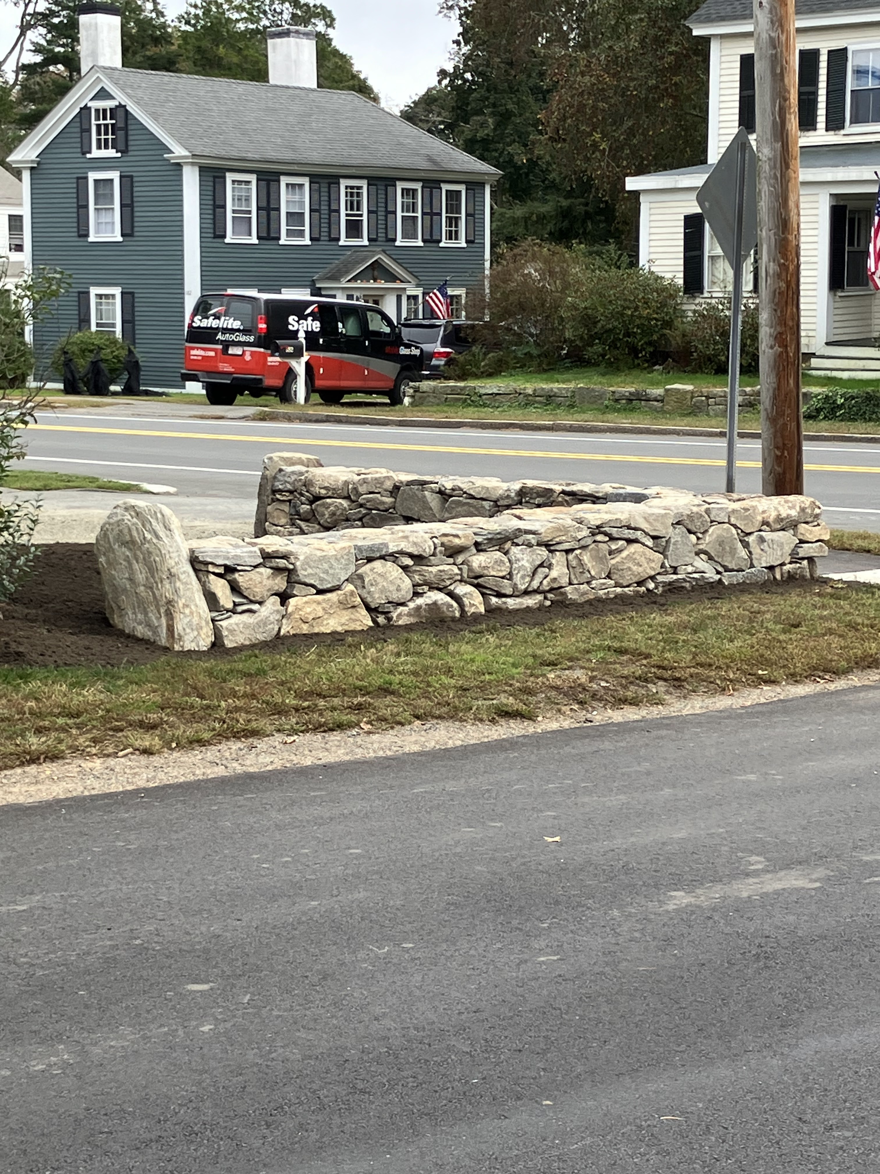 This freestanding, double sided stonewall runs for 125′ along the front and corner of the property and averages 2′ tall. The wall is dry stacked and utilizes reclaimed granite posts to define the ends of each section. The stone was sourced from a local supplier.